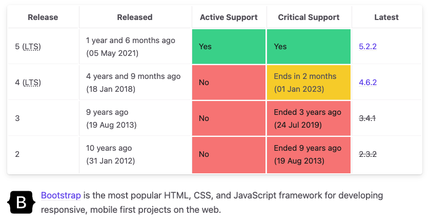 かたや、Bootstrap の最新メジャーバージョンである Bootstrap 5 は 2021年5月にリリースされていますので、そこそこの時間が経過しているように感じますね。とはいえ Bootstrap をアップデートしたところで劇的な変化はないため、安定重視で現行バージョンのまま利用するでも実害ないのでしょう。