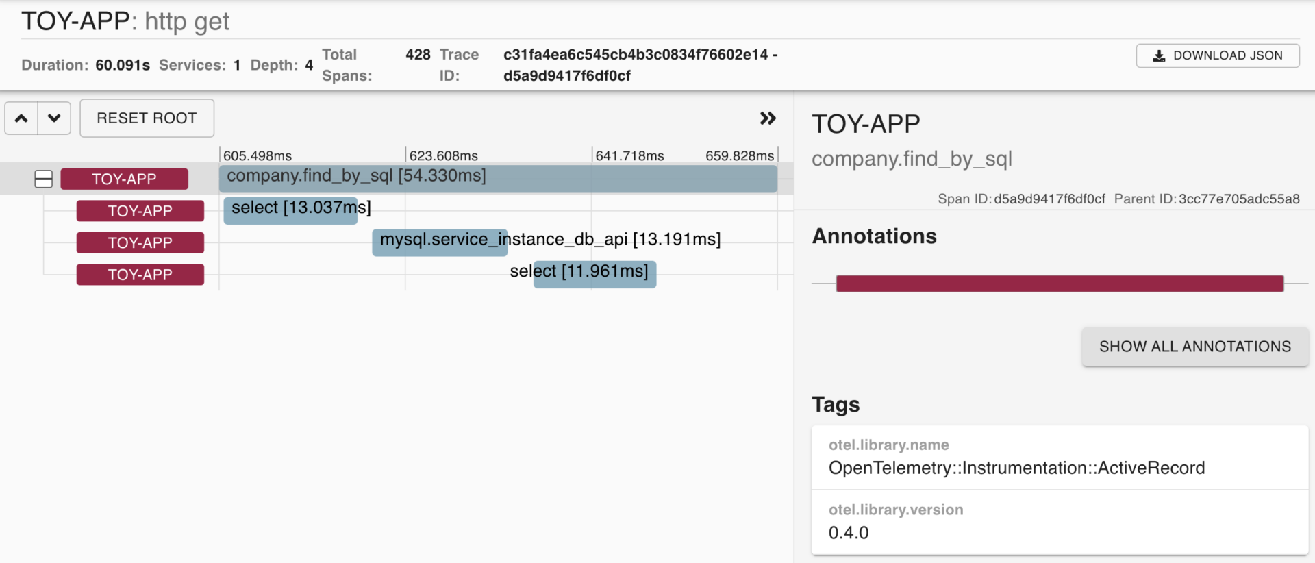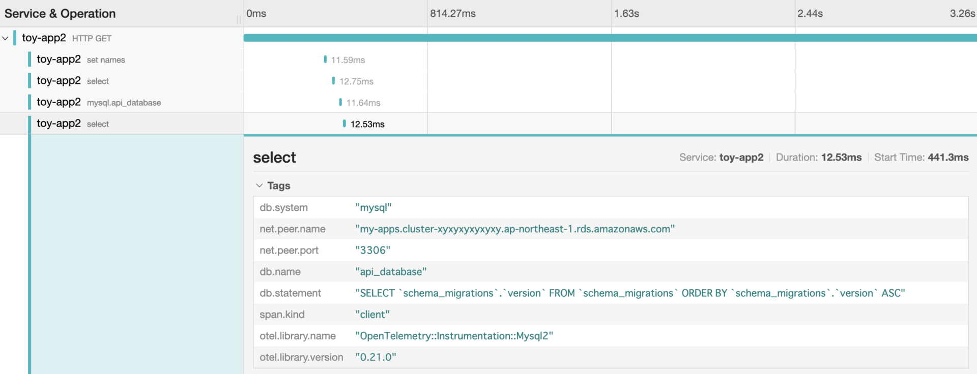OpenTelemetry::Instrumentation::Mysql2 などはの Instrumentation は、こういう部分で細部を表示してくれる役割があるようだ。