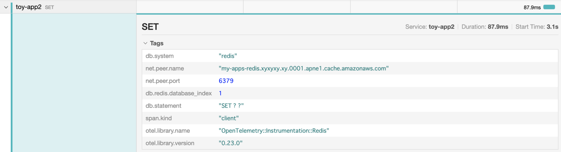OpenTelemetry::Instrumentation::Redis の場合だとこんな感じ。