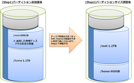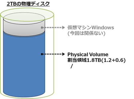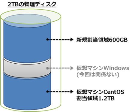 図1のようにCentOS領域は1.2TBである。同一HDD内に600GBの空き容量があったので、これをCentOSに割り当てることとした。今回はシンプロビジョニングを利用しているのでディスクサイズの拡張とするが、新規ディスクの割り当て(増設する)でもほぼ同じ手順と思われる。そしてLVMにて2つの領域を1つであるかのように利用する(図2)。