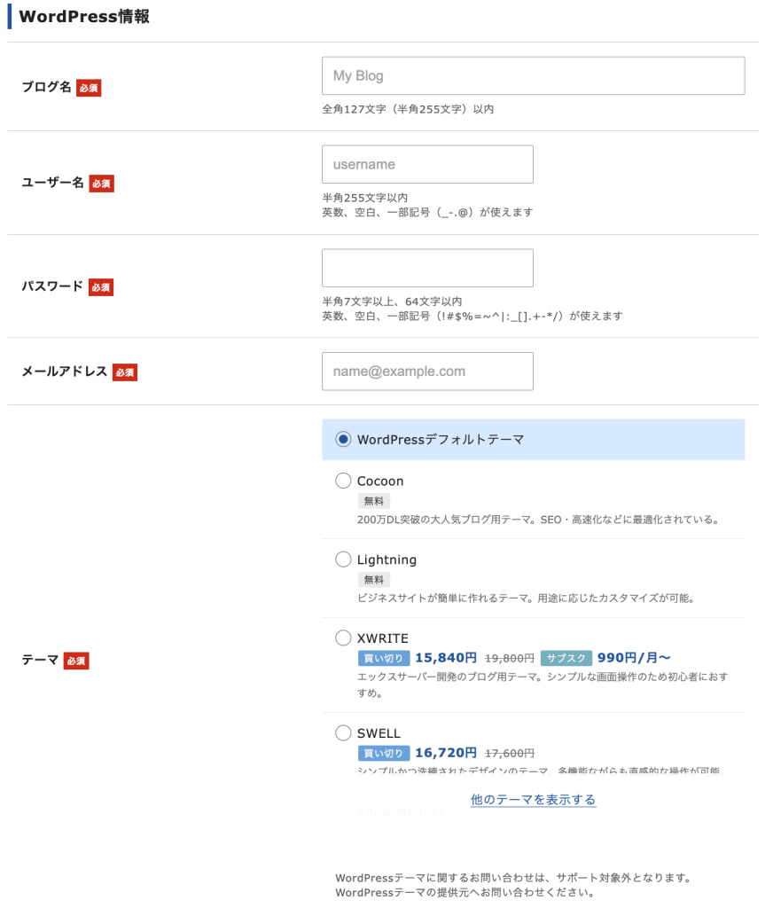 WordPress情報を入力し、テーマを選択