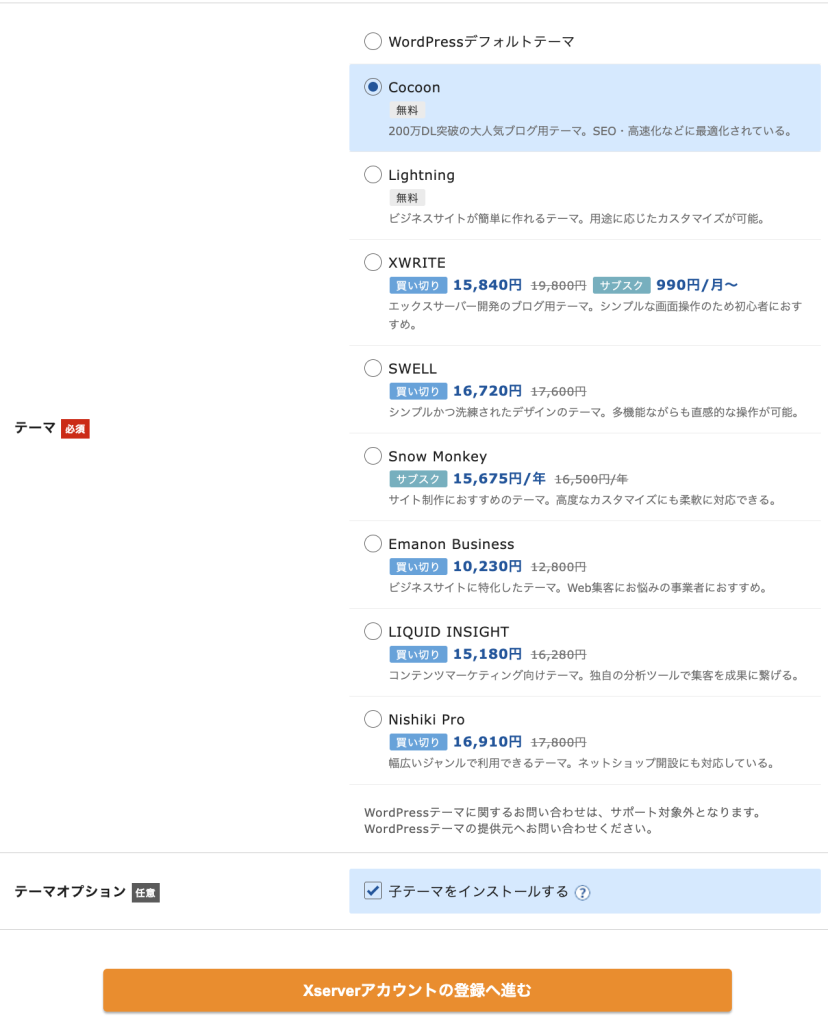 - 徹底的に無料でやる場合: Cocoon を選択