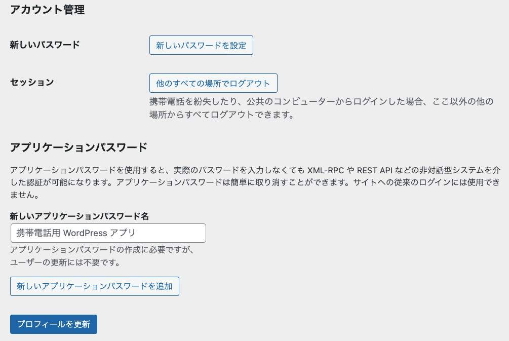 一言でいえば自信が普段WordPressの管理画面にログインするための ID・パスワードとは別に、連携するプログラム向けの専用パスワードを作成する機能です。