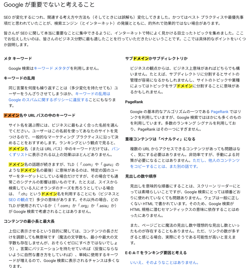 キーワードの使用:サイトの内容に関連するキーワードを含めても、SEO効果はほとんどありませんと謳われています(既出の引用画像より)。無理にキーワードを詰め込むのは避け、自然で覚えやすい名前を選びましょう。あくまでもユーザーのことを考えるのが大切です。